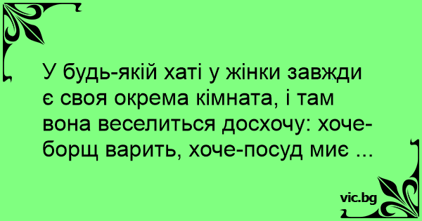У будь-якій хаті у жінки завжди є своя окрема кімната, і там вона веселиться досхочу: хоче-борщ варить, хоче-посуд миє ...