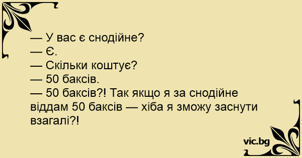 — 50 баксів?! Так якщо я за снодійне віддам 50 баксів — хіба я зможу заснути взагалі?!