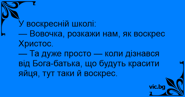 — Та дуже просто — коли дізнався від Бога-батька, що будуть красити яйця, тут таки й воскрес.
