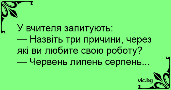 Egy pedagógiai szaklap pályázatot hirdetett fiatal tanárok számára. A feltétel így szólt: "Soroljon fel 3 indokot, amiért ezt a pályát választotta." A díjnyertes válasz így hangzott: "Június,...