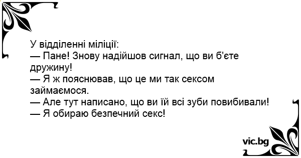 — Пане! Знову надійшов сигнал, що ви б'єте дружину!