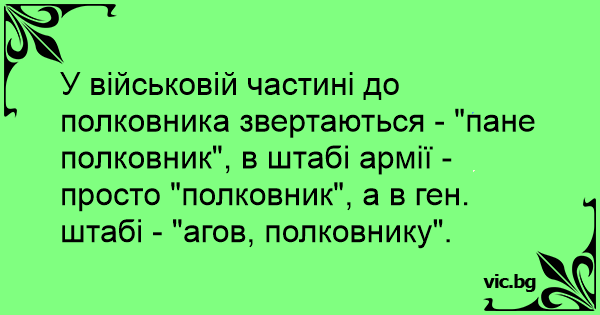 У військовій частині до полковника звертаються - "пане полковник", в штабі армії - просто "полковник", а в ген. штабі - "агов, полковнику".