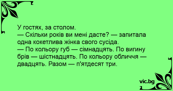 — Скільки років ви мені дасте? — запитала одна кокетлива жінка свого сусіда.
