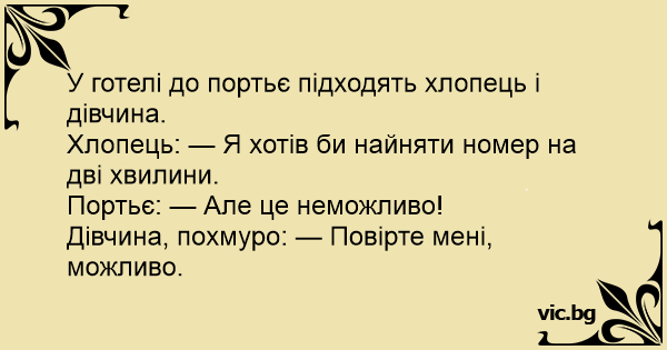 парень: - мы бы хотели снять номер на две минуты. - но это же... Мъж и жена на рецепцията в мотела. Мъжът: Младеж: Трпе оди со Трпана во мотел и на рецепција прашува: Хлопець: - Ми б хотіли зняти номер у вашому готелі на дві хвилини. - Але це ж неможливо! Дівчина (похмуро): - Повірте мені, можливо!