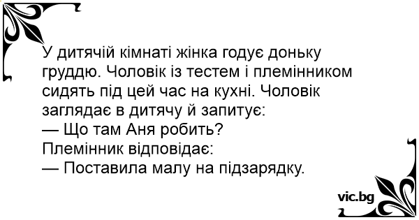 У дитячій кімнаті жінка годує доньку груддю. Чоловік із тестем і племінником сидять під цей час на кухні. Чоловік заглядає в дитячу й запитує: