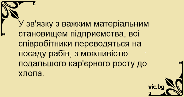 У зв'язку з важким матеріальним становищем підприємства, всі співробітники переводяться на посаду рабів, з можливістю подальшого кар'єрного росту до хлопа.