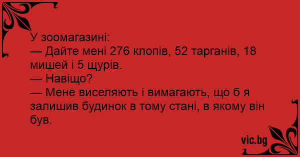 — Дайте мені 276 клопів, 52 тарганів, 18 мишей і 5 щурів.