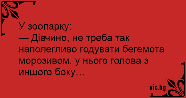— Дівчино, не треба так наполегливо годувати бегемота морозивом, у нього голова з иншого боку…