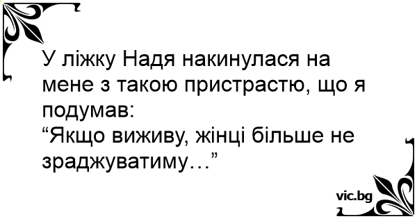 У ліжку Надя накинулася на мене з такою пристрастю, що я подумав: