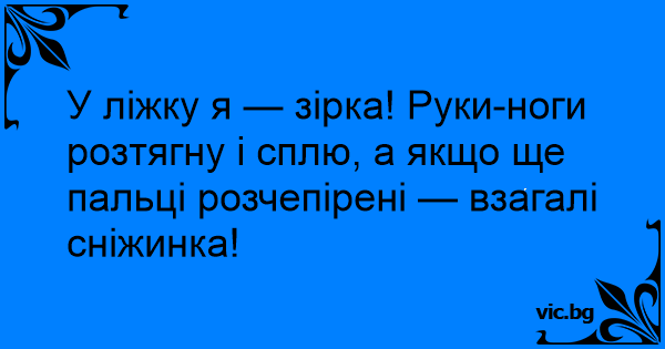 У ліжку я — зірка! Руки-ноги розтягну і сплю, а якщо ще пальці розчепірені — взагалі сніжинка!