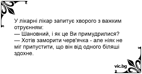 — Хотів заморити черв'ячка - але ніяк не міг припустити, що він від одного біляші здохне.