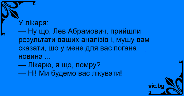 — Ну що, Лев Абрамович, прийшли результати ваших аналізів і, мушу вам сказати, що у мене для вас погана новина ...