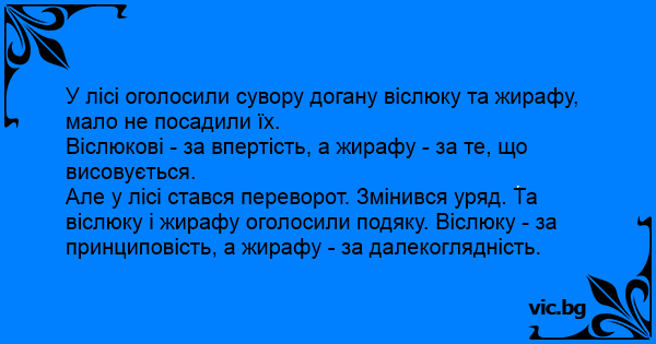 Але у лісі стався переворот. Змінився уряд. Та віслюку і жирафу оголосили подяку. Віслюку - за принциповість, а жирафу - за далекоглядність.