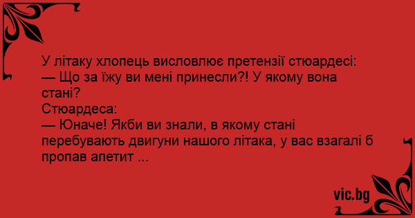 — Юначе! Якби ви знали, в якому стані перебувають двигуни нашого літака, у вас взагалі б пропав апетит ...
