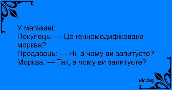 Podchodzi facet do stoiska z warzywami i pyta sprzedawczynię: - Czy te warzywa są modyfikowane genetycznie? Sprzedawczyni mówi: - A właściwie to dlaczego pan się pyta? A marchewka: - No właśnie,...