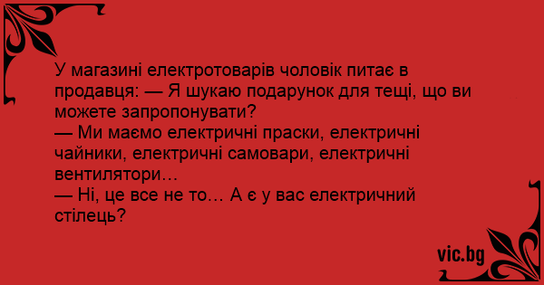 У магазині електротоварів чоловік питає в продавця: — Я шукаю подарунок для тещі, що ви можете запропонувати?