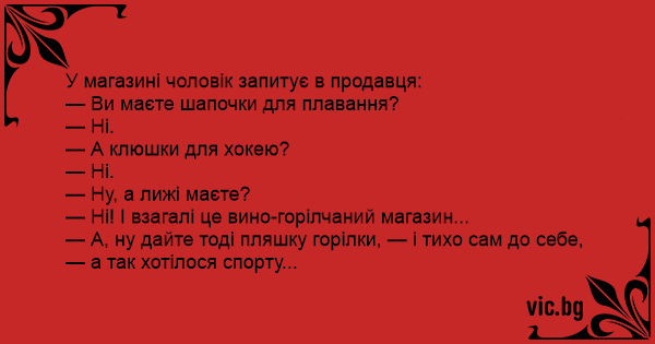 У магазині чоловік запитує в продавця: — Ви маєте шапочки для плавання? — Ні. — А клюшки для хокею? — Ні. — Ну, а лижі маєте? — Ні! І взагалі це вино-горілчаний магазин... — А, ну дайте тоді пляшку горілки, — і тихо сам до себе, — а так хотілося спорту...