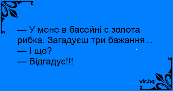 — У мене в басейні є золота рибка. Загадуєш три бажання...