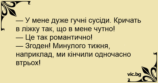 — У мене дуже гучні сусіди. Кричать в ліжку так, що в мене чутно!