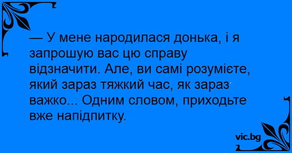 — У мене народилася донька, і я запрошую вас цю справу відзначити. Але, ви самі розумієте, який зараз тяжкий час, як зараз важко... Одним словом, приходьте вже напідпитку.