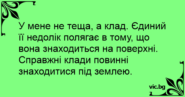 У мене не теща, а клад. Єдиний її недолік полягає в тому, що вона знаходиться на поверхні. Справжні клади повинні знаходитися під землею.