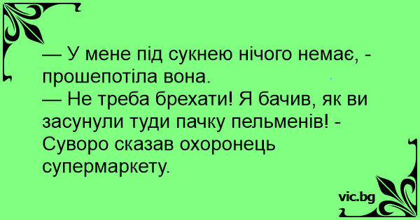 — Не треба брехати! Я бачив, як ви засунули туди пачку пельменів! - Суворо сказав охоронець супермаркету.