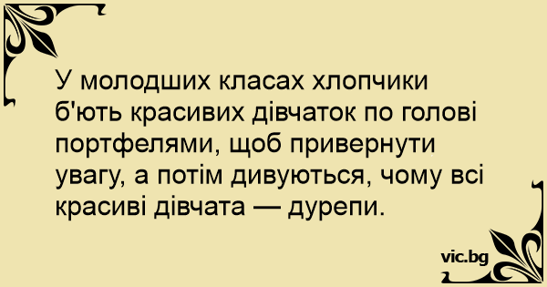 У молодших класах хлопчики б'ють красивих дівчаток по голові портфелями, щоб привернути увагу, а потім дивуються, чому всі красиві дівчата — дурепи.