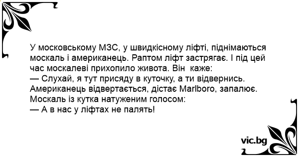 У московському МЗС, у швидкісному ліфті, піднімаються москаль і американець. Раптом ліфт застрягає. І під цей час москалеві прихопило живота. Він каже: