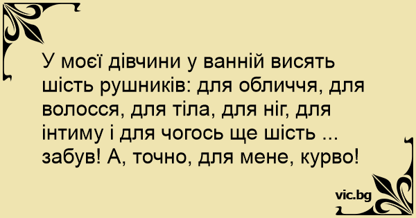 У моєї дівчини у ванній висять шість рушників: для обличчя, для волосся, для тіла, для ніг, для інтиму і для чогось ще шість ... забув! А, точно, для мене, kуpbo!