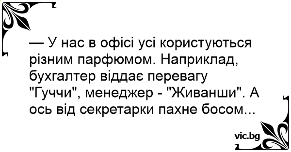 — У нас в офісі усі користуються різним парфюмом. Наприклад, бухгалтер віддає перевагу "Гуччи", менеджер - "Живанши". А ось від секретарки пахне босом...