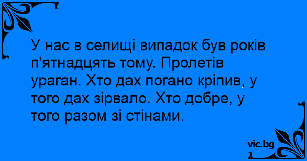 У нас в селищі випадок був років п'ятнадцять тому. Пролетів ураган. Хто дах погано кріпив, у того дах зірвало. Хто добре, у того разом зі стінами.