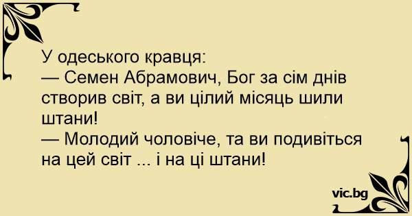 — Семен Абрамович, Бог за сім днів створив світ, а ви цілий місяць шили штани!