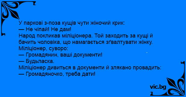 Народ покликав міліціонера. Той заходить за кущі й бачить чоловіка, що намагається зґвалтувати жінку. Міліціонер, суворо: