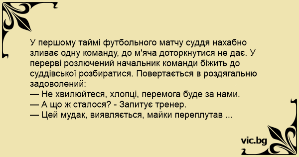 У першому таймі футбольного матчу суддя нахабно зливає одну команду, до м'яча доторкнутися не дає. У перерві розлючений начальник команди біжить до суддівської розбиратися. Повертається в роздягальню задоволений: