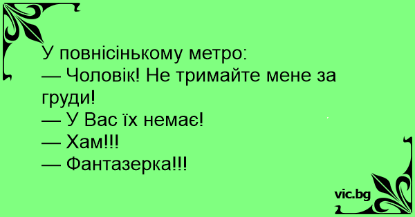 У повнісінькому метро: — Чоловік! Не тримайте мене за груди! — У Вас їх немає! — Хам!!! — Фантазерка!!!