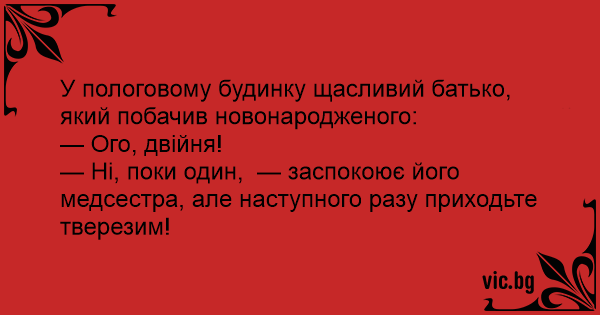 — Ні, поки один, — заспокоює його медсестра, але наступного разу приходьте тверезим!