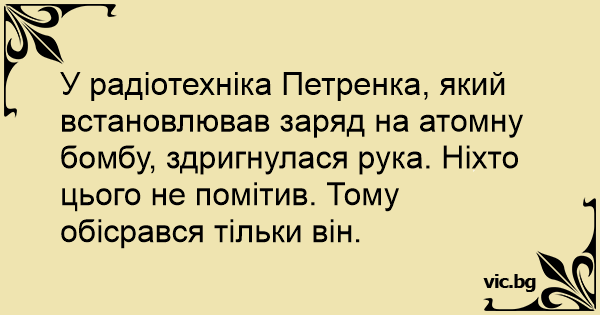 У радіотехніка Петренка, який встановлював заряд на атомну бомбу, здригнулася рука. Ніхто цього не помітив. Тому обісрався тільки він.