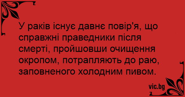 У раків існує давнє повір'я, що справжні праведники після смерті, пройшовши очищення окропом, потрапляють до раю, заповненого холодним пивом.