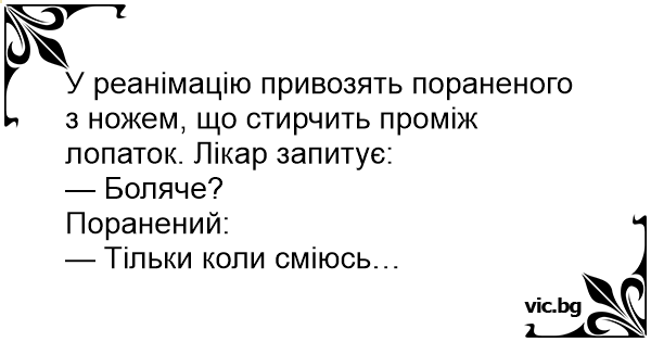 У реанімацію привозять пораненого з ножем, що стирчить проміж лопаток. Лікар запитує: