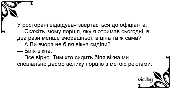 — Скажіть, чому порція, яку я отримав сьогодні, в два рази менше вчорашньої, а ціна та ж сама?