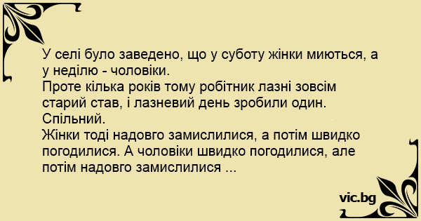 У селі було заведено, що у суботу жінки миються, а у неділю - чоловіки.