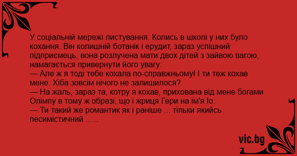 У соціальній мережі листування. Колись в школі у них було кохання. Він колишній ботанік і ерудит, зараз успішний підприємець, вона розлучена мати двох дітей з зайвою вагою, намагається привернути його увагу: — Але ж я тоді тебе кохала по-справжньому! І ти теж кохав мене. Хіба зовсім нічого не залишилося? — На жаль, зараз та, котру я кохав, прихована від мене богами Олімпу в тому ж образі, що і жриця Гери на ім'я Іо. — Ти такий же романтик як і раніше ... тільки якийсь песимістичний ... (Пауза, вона гуглит) Тварюка! Я ненавиджу тебе! Я дізналася що Іо перетворили на корову!