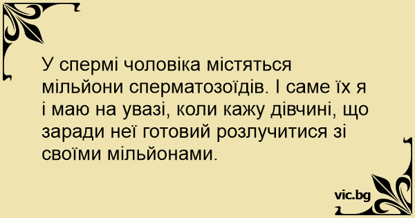 У спермі чоловіка містяться мільйони сперматозоїдів. І саме їх я і маю на увазі, коли кажу дівчині, що заради неї готовий розлучитися зі своїми мільйонами.