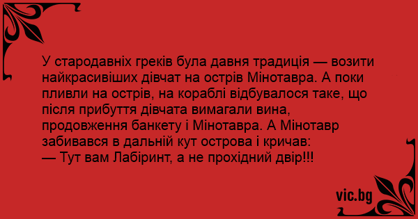 У стародавніх греків була давня традиція — возити найкрасивіших дівчат на острів Мінотавра. А поки пливли на острів, на кораблі відбувалося таке, що після прибуття дівчата вимагали вина, продовження банкету і Мінотавра. А Мінотавр забивався в дальній кут острова і кричав: