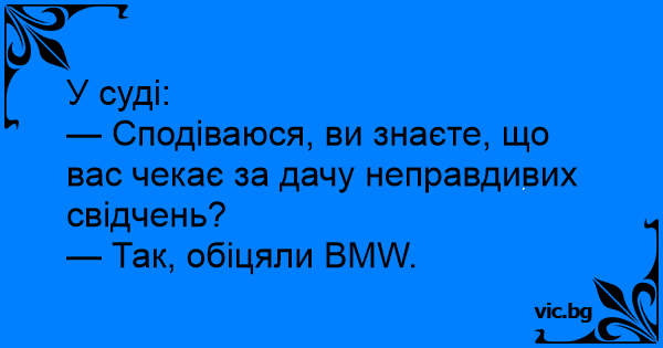 — Звинувачуваний, чи знаєте ви, що за неправдиві показання вам загрожує три роки ув’язнення? — запитує суддя підсудного. — Ні, ваша честь. Але знаю добре, що коли скажу правду, то буде значно більше.