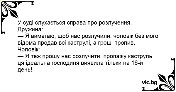 — Я вимагаю, щоб нас розлучили: чоловік без мого відома продав всі каструлі, а гроші пропив.