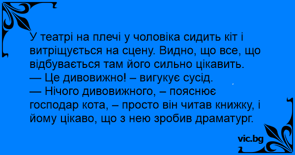— Нічого дивовижного, – пояснює господар кота, – просто він читав книжку, і йому цікаво, що з нею зробив драматург.