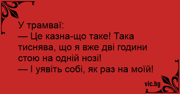 — Це казна-що таке! Така тиснява, що я вже дві години стою на одній нозі!