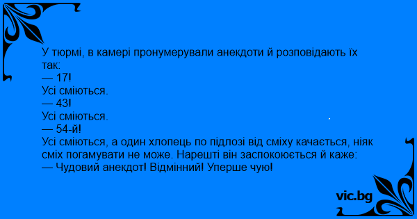 У тюрмі, в камері пронумерували анекдоти й розповідають їх так: