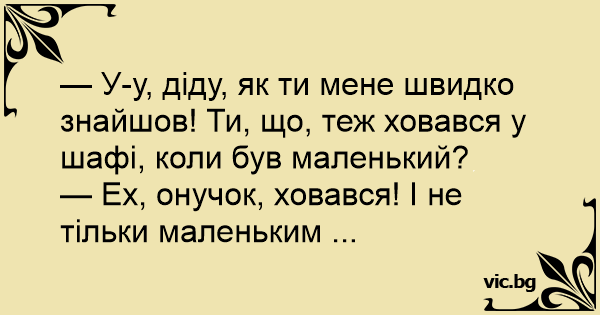 — У-у, діду, як ти мене швидко знайшов! Ти, що, теж ховався у шафі, коли був маленький?
